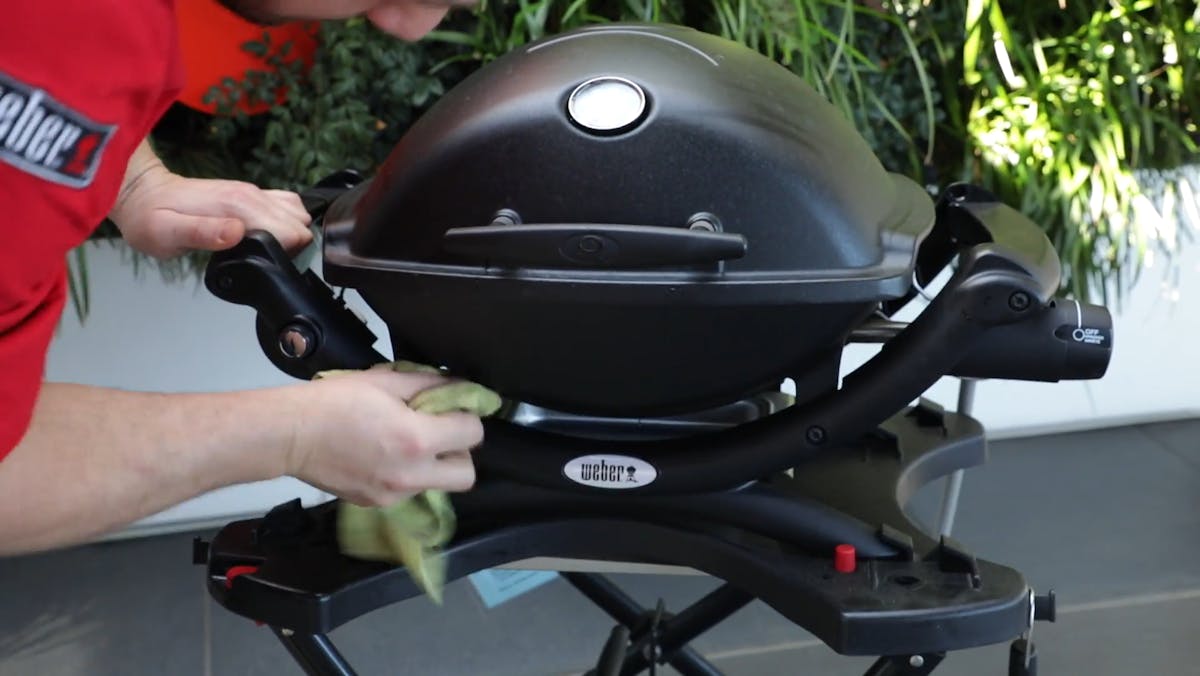 Use hot water with dishwashing detergent to wash down your lid, side tables and any other exterior components, or a Weber barbecue cleaner for more stubborn stains.
