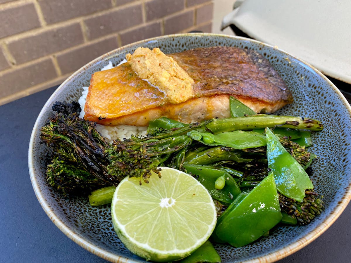 This meal is healthy, uses minimal ingredients, perfect to cook on the barbecue and is packed with flavour. The laksa butter is the perfect accompaniment to the crispy skin salmon and grilled greens