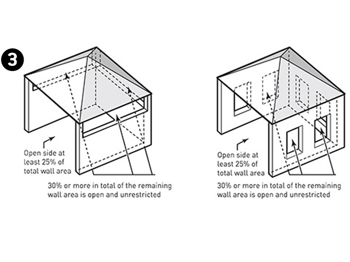 - Within a partial enclosure that includes an overhead cover and more than two walls, the following shall apply (refer to diagrams 3):
