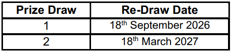 14. If a prize is still unclaimed after three calendar months of the original prize draw, the Promoter will conduct a further draw for the prize at the same time and place as the original prize draw, subject to any directions from any regulatory authority. The Date for the draw would be: