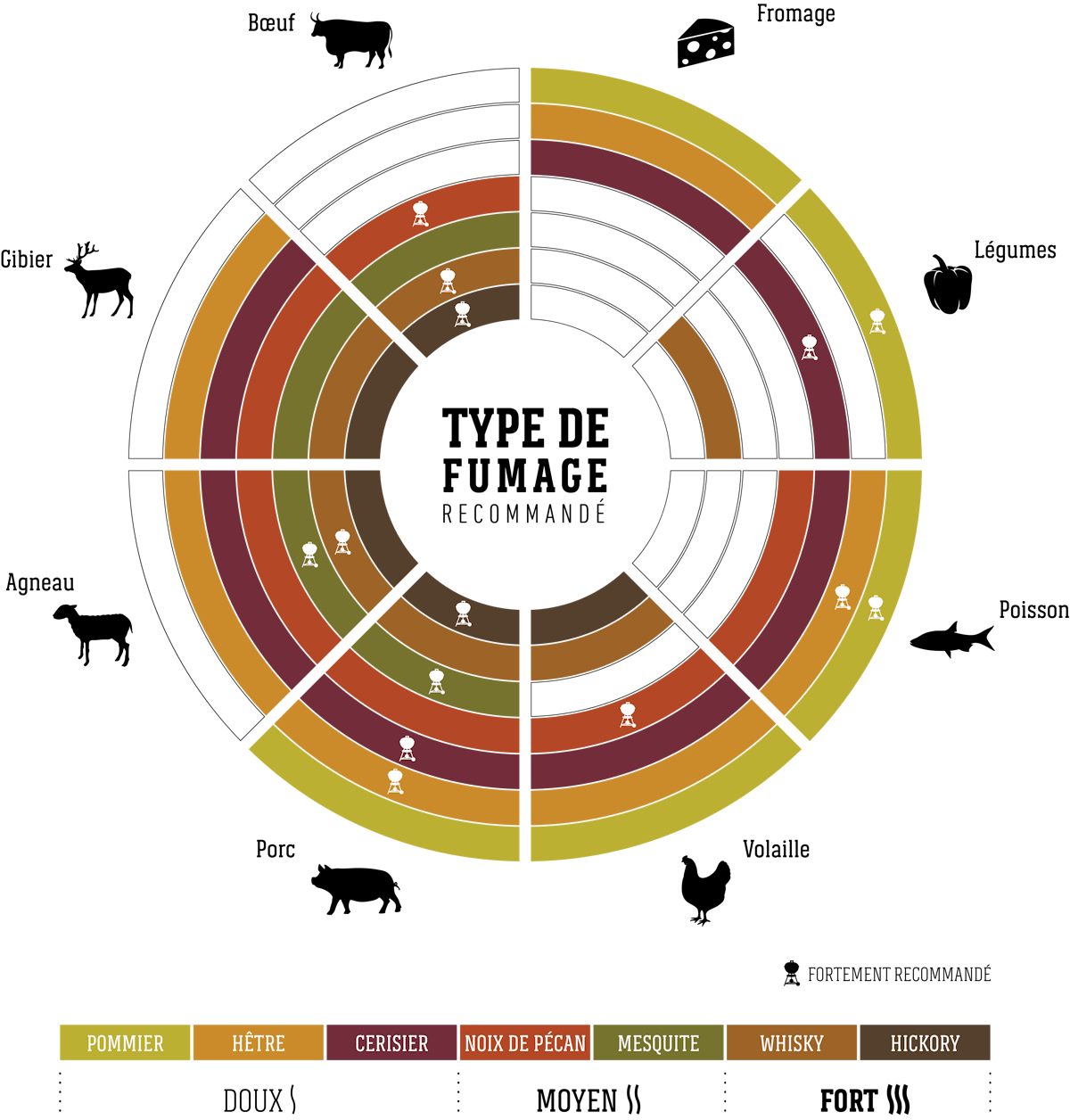 En général, il suffit de choisir entre la sciure de fumage, les copeaux et les morceaux de bois. La sciure est surtout utilisée pour le fumage à froid et les copeaux sont parfaits pour le fumage rapide. Les morceaux de bois en revanche, conviennent parfaitement à une cuisson lente en les plaçant directement sur les briquettes. La quantité de bois nécessaire est une question de goût, mais il vaut mieux en mettre peu que trop, car le goût a tendance à devenir amer. Vous pouvez faire des expériences avec toutes les essences de bois, pas uniquement les résineux. La gamme Weber en propose plusieurs types différents : hickory, mesquite, noix de pécan, cerisier, pommier, whisky et hêtre. Chacun transmet à la nourriture ses caractéristiques propres. Vous trouverez ci-contre les meilleures associations de type de bois et de type d’aliment.