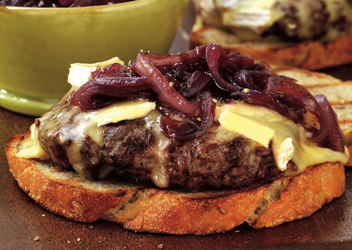 - Build each burger on a bread slice with a patty, red onion jam, a generous grinding of pepper, and the remaining bread slice. Serve warm.