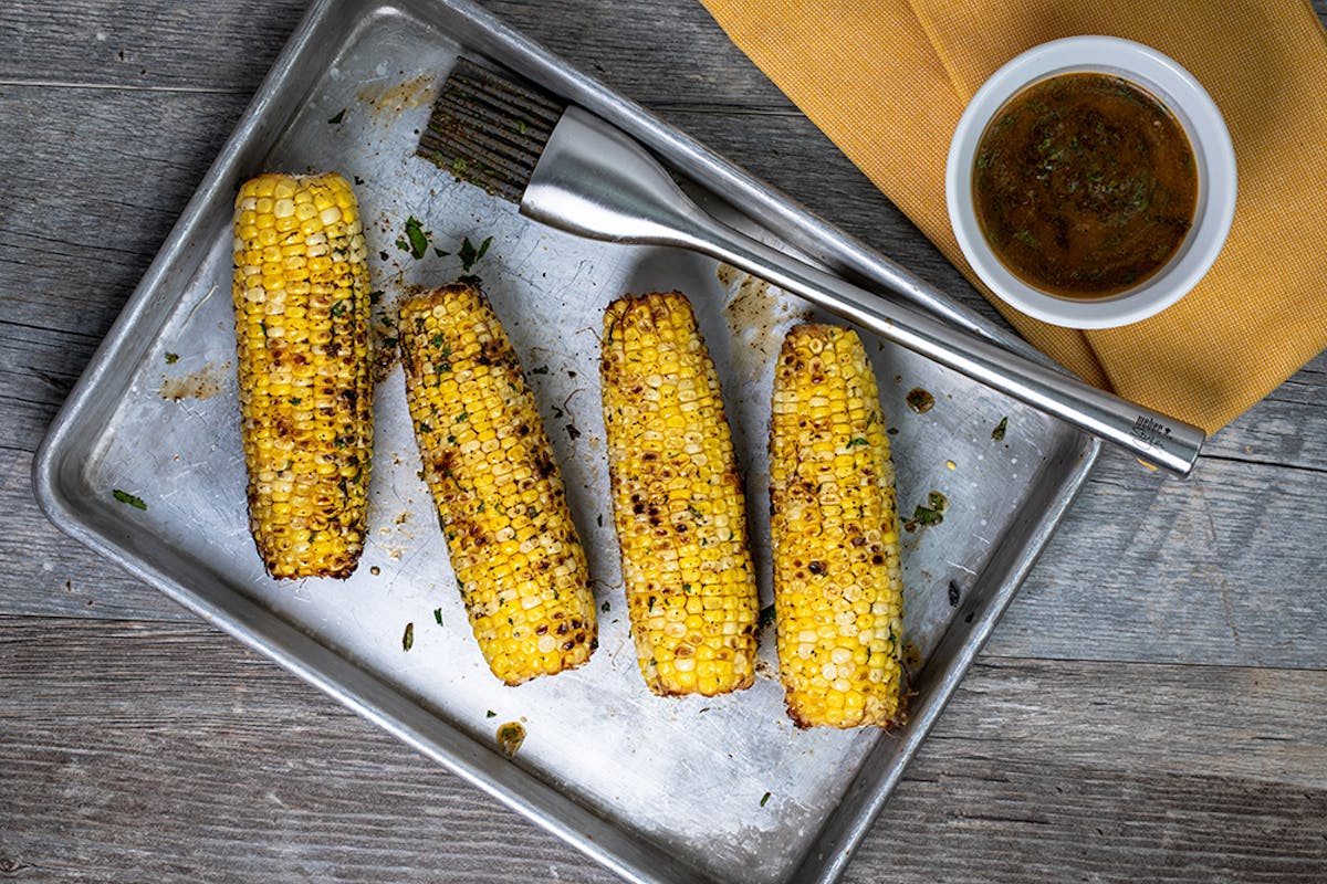 - Brush the cooking grates clean. Grill the corn over direct medium heat, with the lid closed, until the kernels are browned in spots and tender, 10 to 15 minutes, turning occasionally. Remove from the grill.