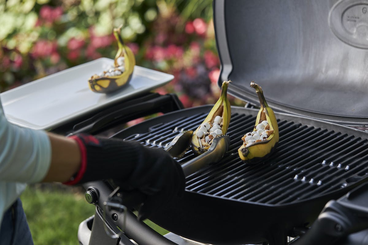- Grill the stuffed bananas over indirect medium heat, with the closed, until the chocolate melts, the marshmallows brown, and the peels turn dark, 12 to 15 minutes.