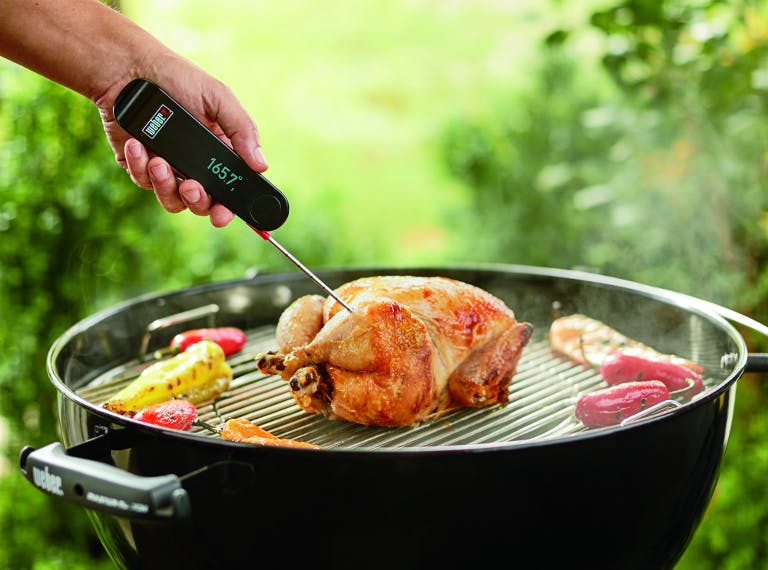 Digitale Thermometer haben eine LCD-Anzeige, auf der sie die Temperatur anzeigen. Ein Beispiel für ein digitales Modell ist das Weber Snapcheck-Thermometer, dass in drei Sekunden anzeigt, ob dein Steak auf den Punkt gar ist. Ein einfaches Modell wäre das Weber Thermometer mit Sofortanzeige.