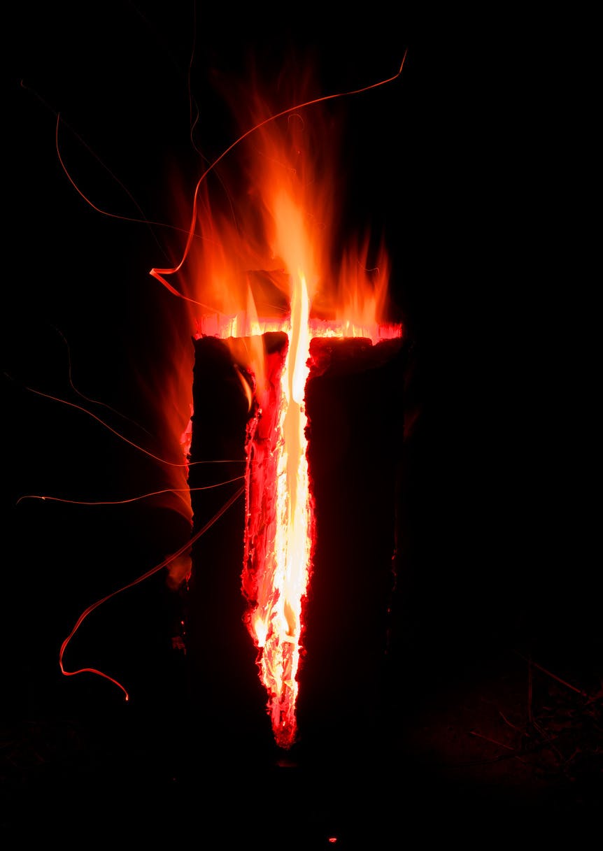 Mit einer Säge, am besten einer Kettensäge, setzt du von oben zwei, drei oder vier senkrechte Schnitte, so dass sich der Stamm in vier, sechs oder acht Teile spaltet. Der Sägeschnitt sollte circa zehn Zentimeter vor dem unteren Ende des Stammes aufhören, damit das Schwedenfeuer beim Brennen nicht auseinanderfällt.