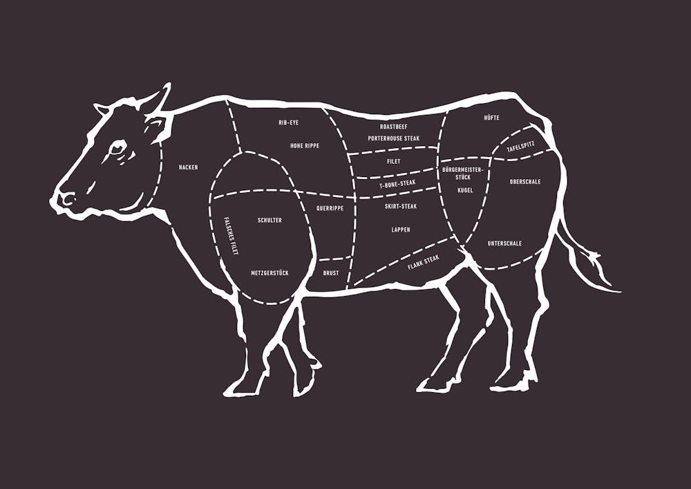 - Die klassischen Cuts stammen aus dem Rückenteil des Rinds zwischen Schulter und Keule. Roastbeef oder auch Rumpsteak genannt, werden hier rausgeschnitten, ebenso das davorliegende Rib-Eye, bei uns besser als Entrecote bekannt.