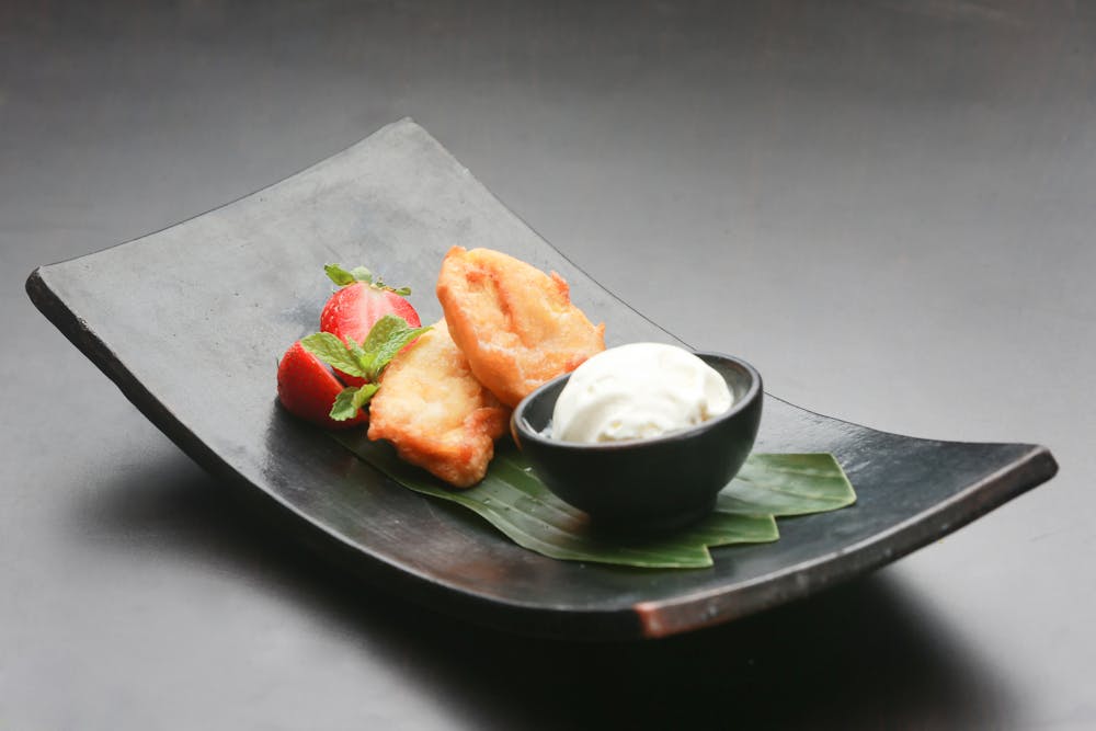 Ein süßer Abschluss darf auch bei einem asiatischen Menü nicht fehlen. Stilecht rundest du den Abend mit gebackenen Bananen ab – natürlich frittiert im Wok. Dafür rührst du zunächst den Teig an, mit dem du die Bananenstücke panierst. Für vier Portionen nimmst du 80 Gramm Mehl, einen Teelöffel Backpulver, eine Prise Salz und einen Esslöffel Zucker. Alles mit einem Schneebesen in einer Schüssel vermengen und nach und nach acht Esslöffel Wasser einrühren, bis ein glatter Teig entsteht. Erhitze in der Zwischenzeit Raps- oder Sonnenblumenöl im Wok und schneide zwei Bananen in zwei bis drei Zentimeter große Stücke. Die Bananenscheiben durch den Teig ziehen und im heißen Öl circa zwei Minuten lang frittieren, bis sie goldbraun sind. Mit einer Schöpfkelle zum Abtropfen auf Küchenpapier legen und anschließend mit Honig beträufelt servieren. Vanilleeis oder Obstsalat ergänzen die süßen Happen gut.