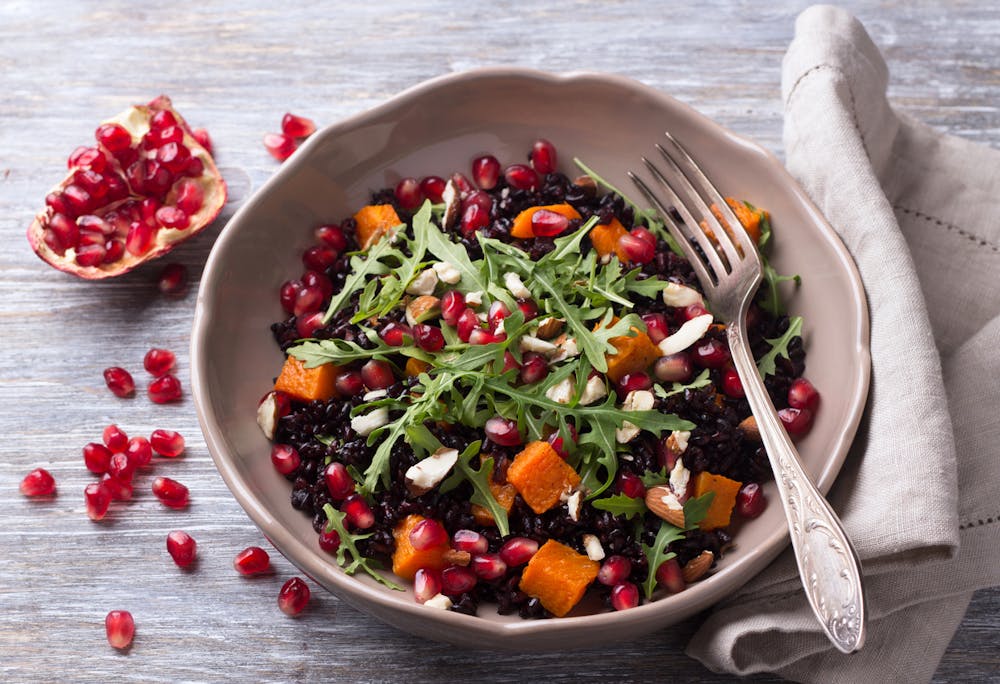 Achte darauf, die Salatblätter möglichst klein zu schneiden. Verzichte auf Sattmacher und grille nur eine kleine Menge Halloumi oder Garnelen (ohne Schale) als Topping. Die wichtigste Zutat nicht vergessen: Granatapfelkerne als geniale Garnitur. Die saftigen Kerne haben eine zellerneuernde Wirkung und gelten seit der Antike als Zeichen der Fruchtbarkeit.