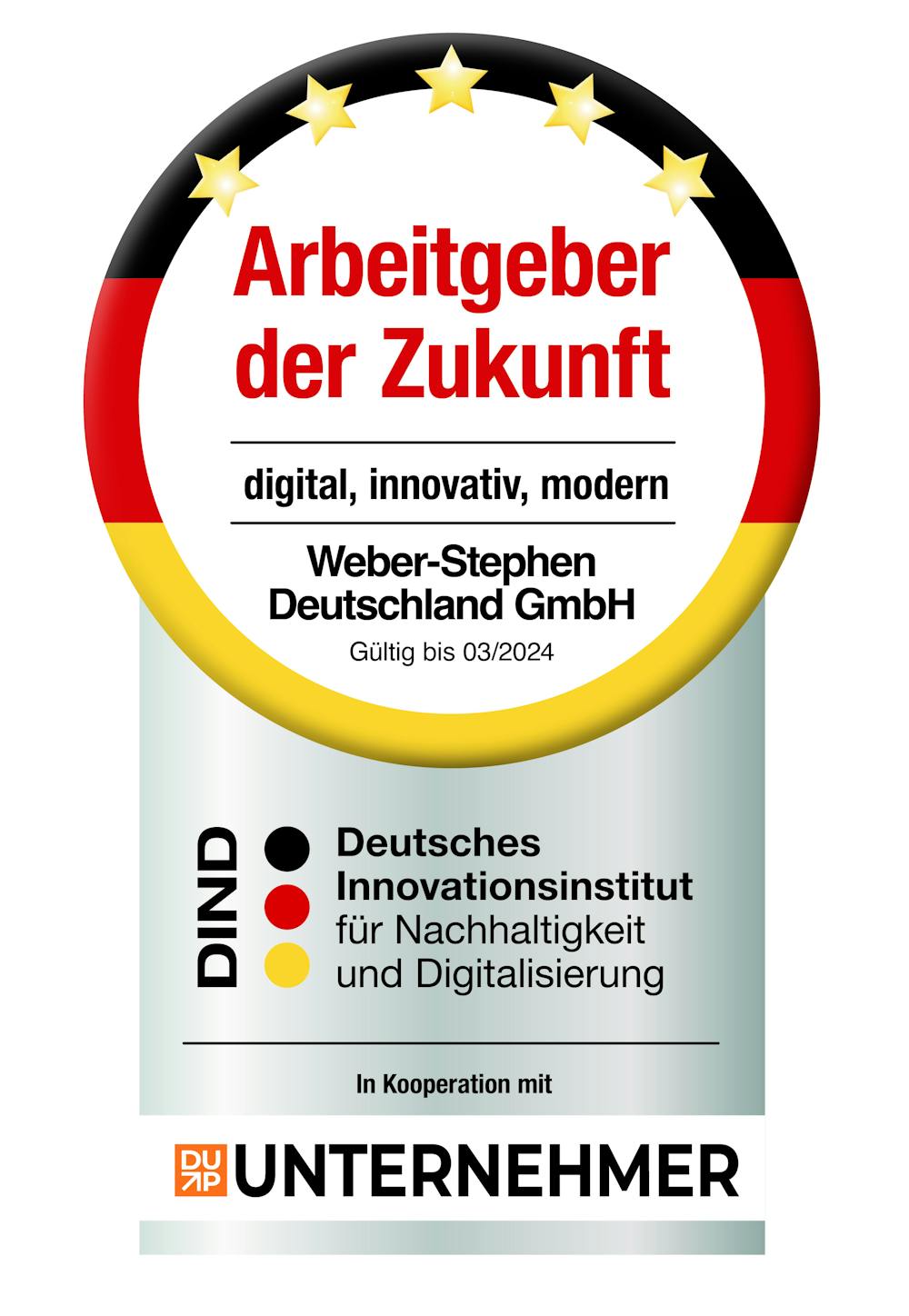 Das Deutsche Innovationsinstitut für Nachhaltigkeit und Digitalisierung verleiht der Weber-Stephen Deutschland GmbH auf Basis des bestandenen zweistufigen Prüfprozesses die Auszeichnung Arbeitgeber der Zukunft.