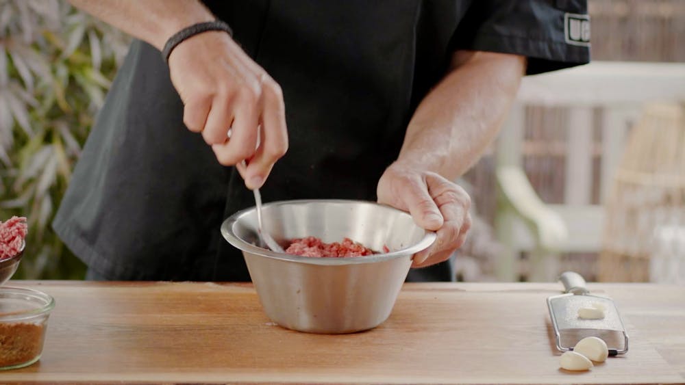 Hvis du rør og ælter for meget og længe i farsen, er der en risiko for, at bøffen bliver både sej og tør. Når du blander farsen sammen, anbefaler vi derfor, at du arbejder så omhyggeligt som muligt. På denne måde holder farsen sig luftig, hvilket også sikrer en saftigere hamburger i sidste ende.