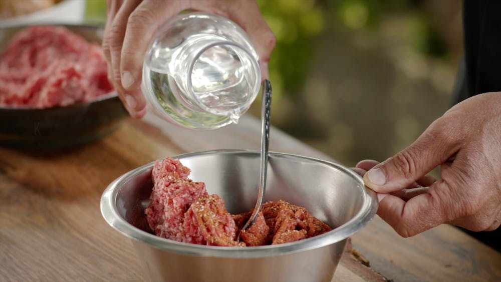 En lille mængde koldt vand gør en stor forskel, når du skal blande krydderier og hvidløg i kødet. Vandet lader krydderier og andre smagsgivere trænge godt ind i kødet. En elastisk fars er derudover væsentlig nemmere at forme.