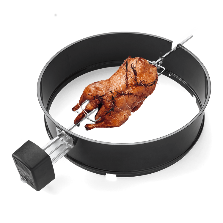 Rotisseri – rotisseriet fås som tilbehør til alle Webers grill. Sæt en eller to ænder på stegespyddet (afhængig af spyddets længde), og lad anden snurre på rotisseriet, så den bliver grillet jævnt hele vejen rundt. Andens fedt og sky ”løber med rundt”, mens anden tilberedes, og ”smører” således anden med eget fedt undervejs. Når du tilbereder anden på rotisseri, bliver den derfor maksimalt saftig, samtidig med at skindet bliver lækkert og sprødt. Du kan nemt opsamle stegesky og fedt til sauce ved at placere en foliebakke under stegen på rotisseriet. Se Webers opskrift på grillet and på rotisseri