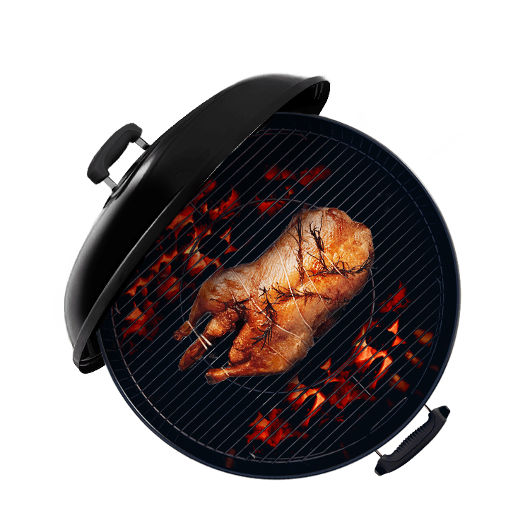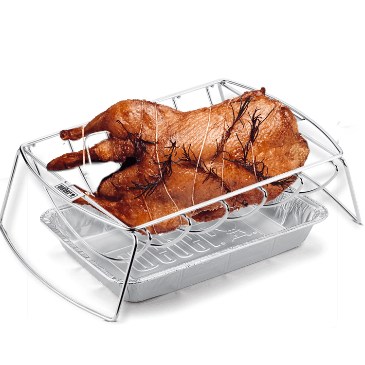 Stegholder – løfter stegen fra risten, så den grilles jævnt hele vejen rundt. Også praktisk, når anden skal bæres til og fra grillen. Du kan nemt stille stegholderen i en foliebakke og opsamle stegesky til sauce. Passer perfekt til grillning af en and ad gangen og er perfekt til brug med iGrill-termometeret.