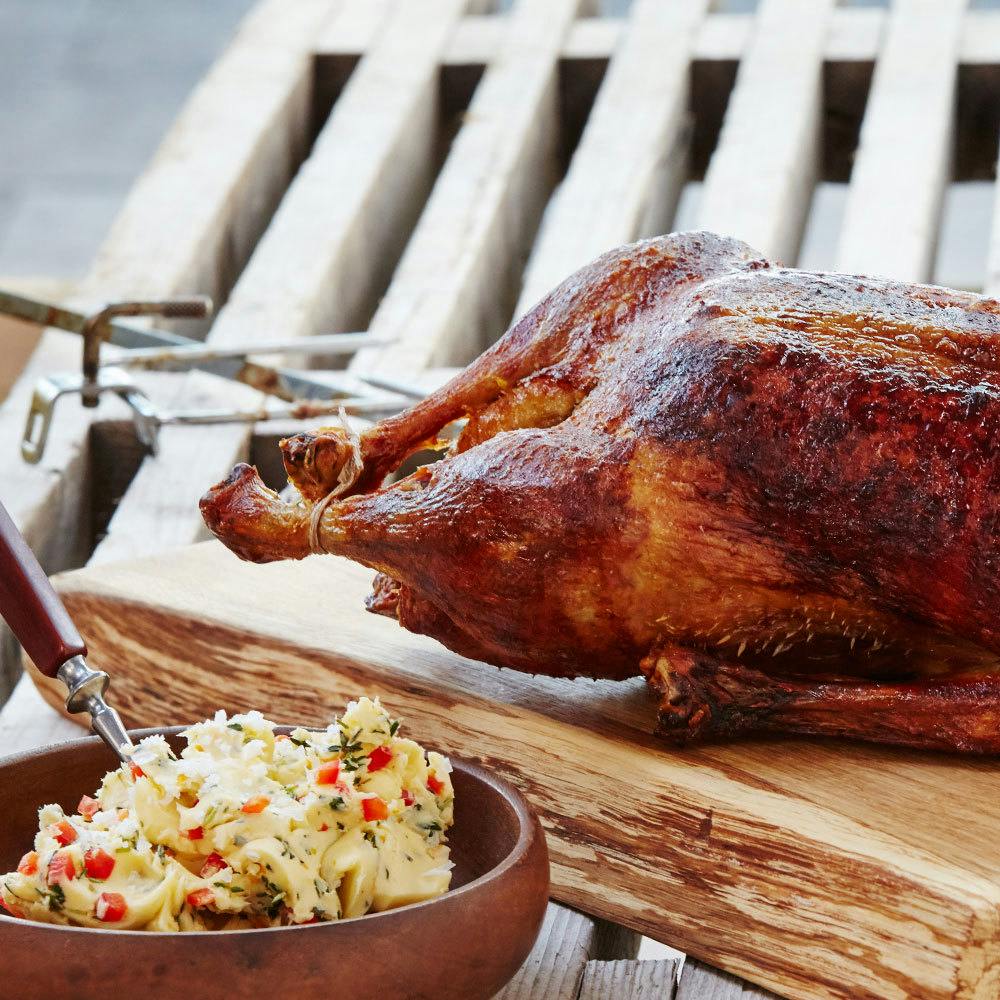 En anden mulighed er at lave en krydderiblanding med fedtstof, som du lægger under skindet ”i lommer” på brystet og ryggen på anden. Se Webers opskrift på grillet and med chilismør-blanding.