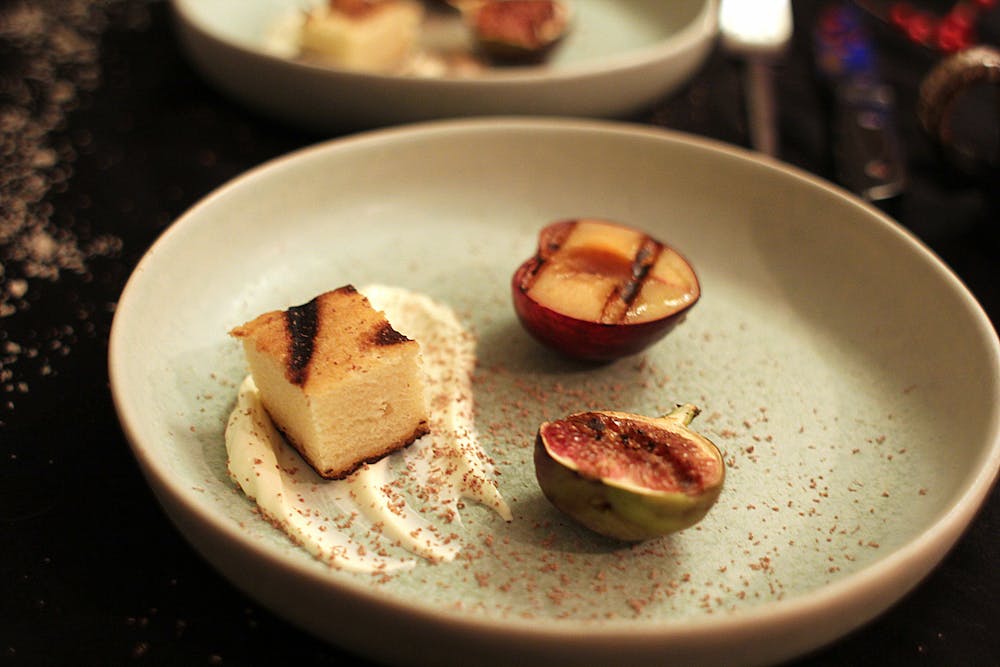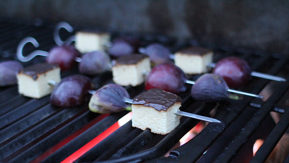 Nytårsdesserten byder på grillet mazarinkage på spyd med vaniljecreme og grillede blommer og figner. Den grillede mazarinkage runder årets grilloplevelser af som et sand festfyrværkeri – perfekt til årets sidste aften.