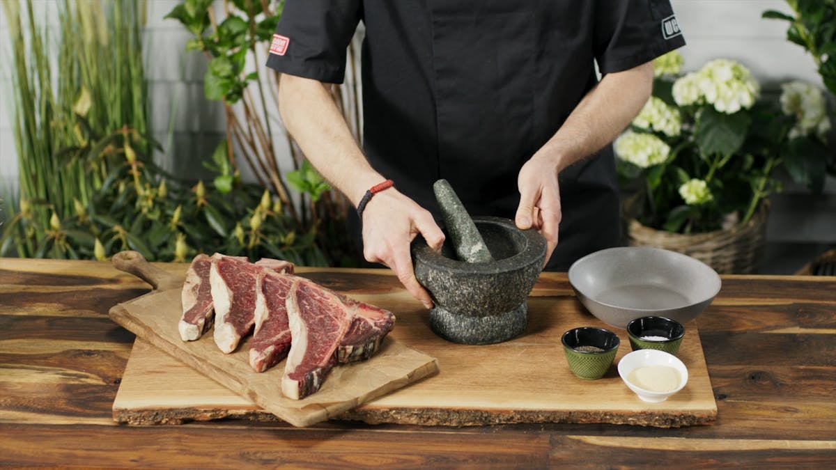 T-bone steak adskiller sig drastisk fra andre udskæringer, da den består af forskellige strukturer. Navnet kommer fra det T-lignende ben, der adskiller oksemørbraden fra højrebsstegen, og udskæringen er taget fra den nederste del af højrebet. Med en T-bone steak på tallerkenen nyder du altså både en mørbrad og højrebssteg, hvoraf sidstnævnte er dominerende. Kødudskæringen kræver dermed lidt ekstra omtanke under tilberedningen, men det er nemt at komme sikkert i mål, så længe du har det rette tilbehør ved hånden. Takket være de forskellige strukturer i T-bone steaks er der heller ikke brug for krydderier eller marinader for at få en fantastisk smagsoplevelse – det er nok med en rub bestående af salt og peber. Bland krydderierne sammen i en morter, pensl kødet med solsikkeolie og påfør et generøst lag krydderier på den ene side af kødet inden grillning.