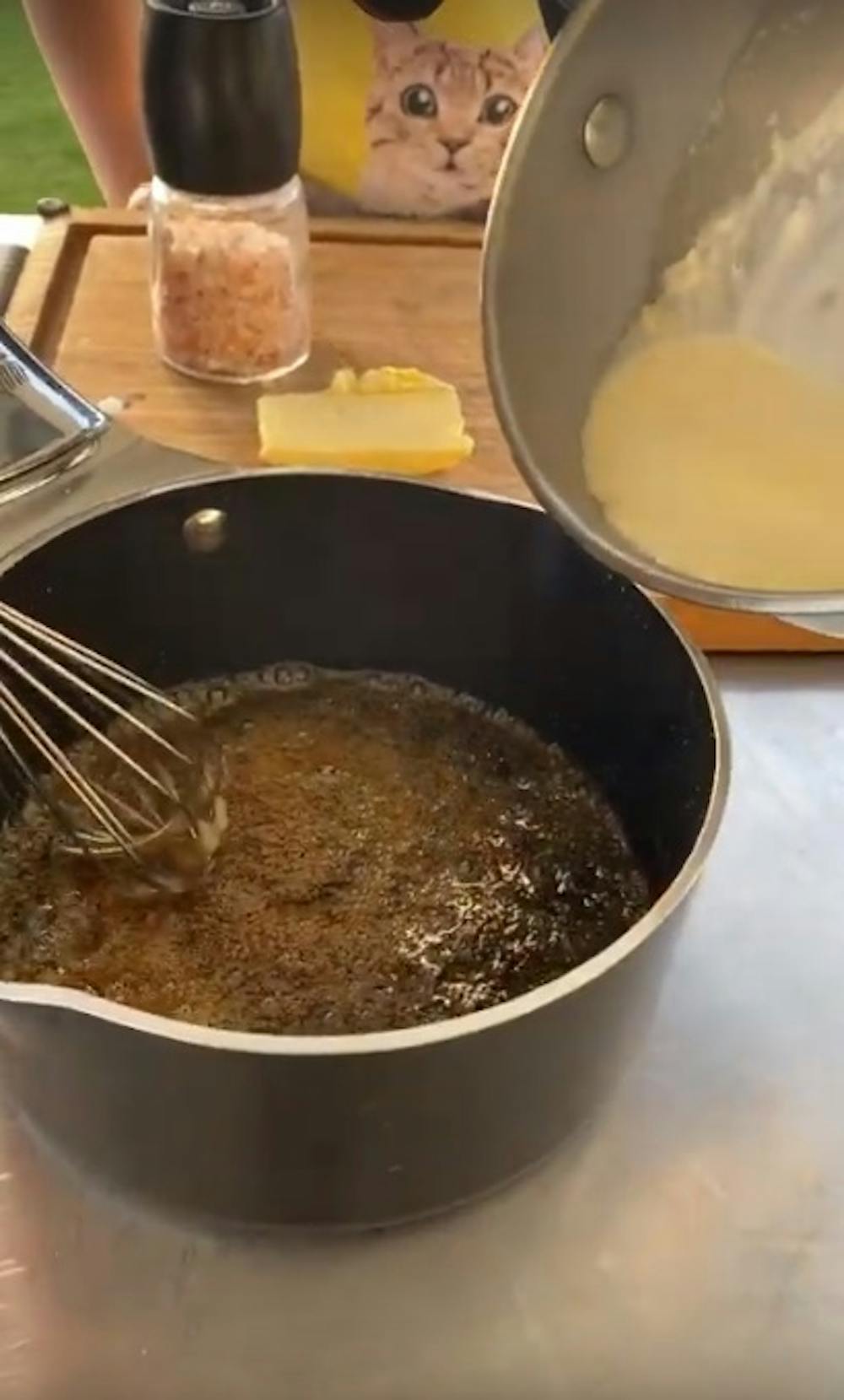 - Ajoutez la crème encore chaude, attention aux projections. Enfin ajoutez le beurre salé. Laissez refroidir