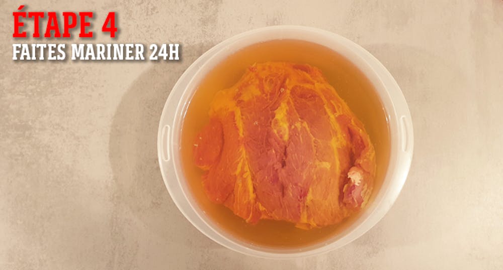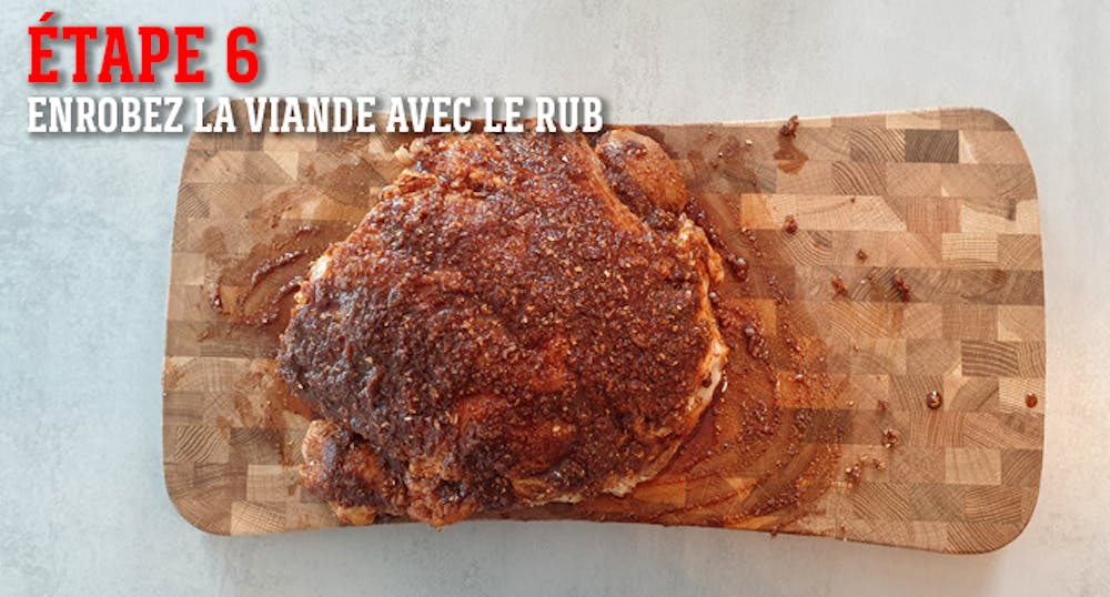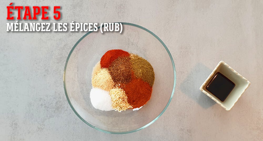 - Le lendemain : mélangez tous les ingrédients du rub (marinade sèche). Sortez la palette de la marinade, séchez-la à l’aide d’un linge et enrobez-la avec le rub.