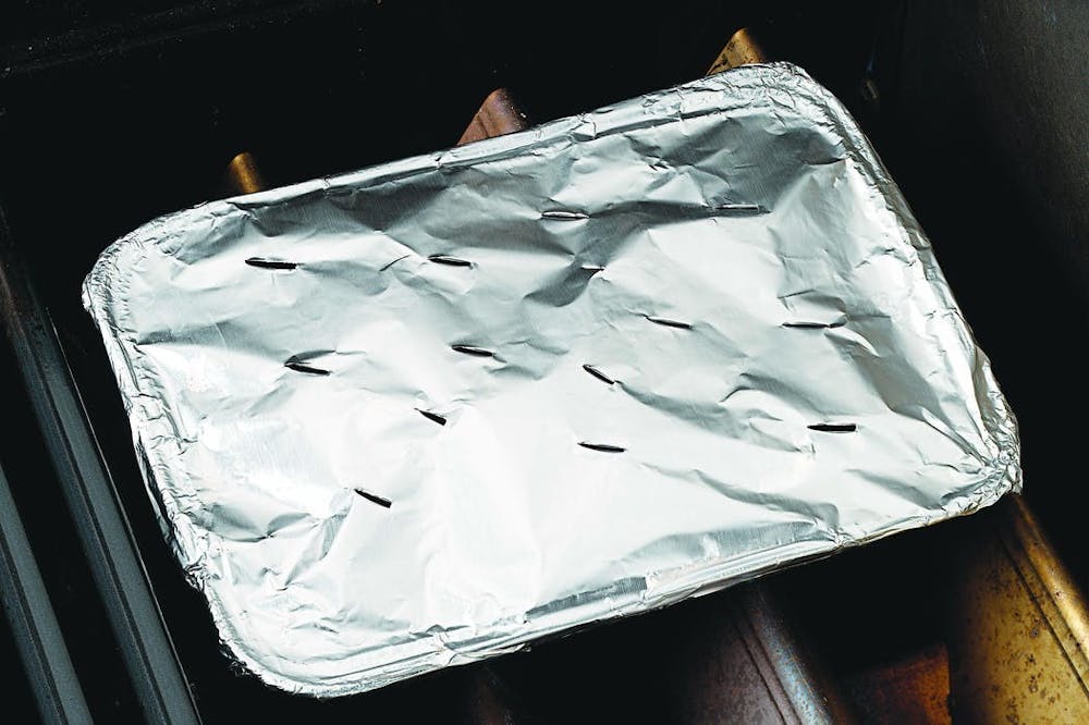 Smoking on a charcoal barbecue is really easy to do, especially if you are already comfortable barbecuing with indirect heat. Begin by filling a chimney starter about one-third full with briquettes. When they are fully lit, pour all of the charcoal on one side of the cooking grate (if desired, use a charcoal basket, which holds the coals close together so they burn more slowly) and place a large disposable foil pan on the other side.