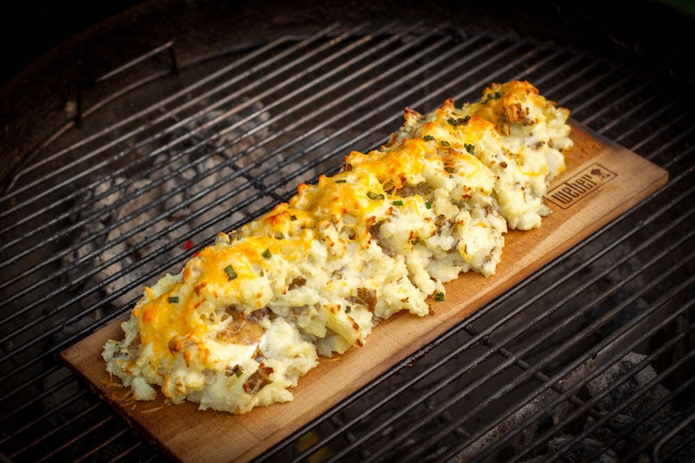 - Grill the empty plank over direct medium heat until the plank begins to smolder. Add the mashed sweet potatoes to the grilled side of the plank.