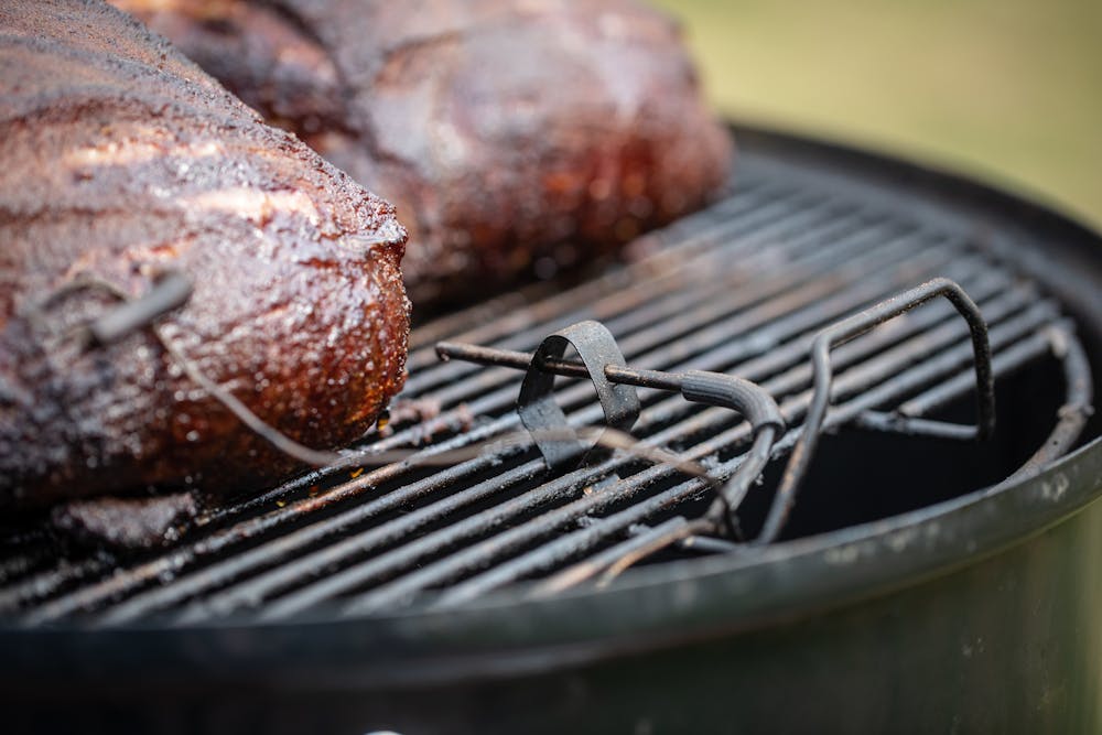 Place the pork on the grill fat side up and insert an iGrill probe into the center mass of each piece being careful to avoid contact with the bone.