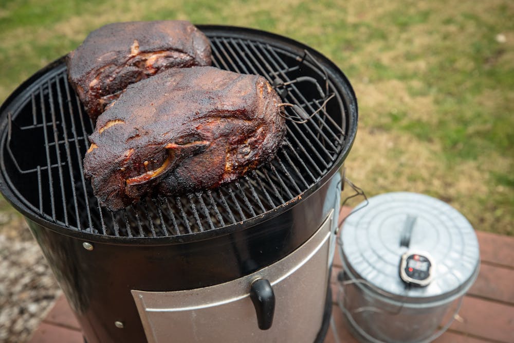 Once the cook is underway and the WSM is “in the zone,” it only needs periodic checking. The pork should be removed when its internal temperature hits 200° F. Depending on the size and amount of meat in the smoker, this can take 8-10 hours. If later in the cook the temperature of the smoker begins to climb, additional water may need added to the water pan, as water is lost to evaporation.