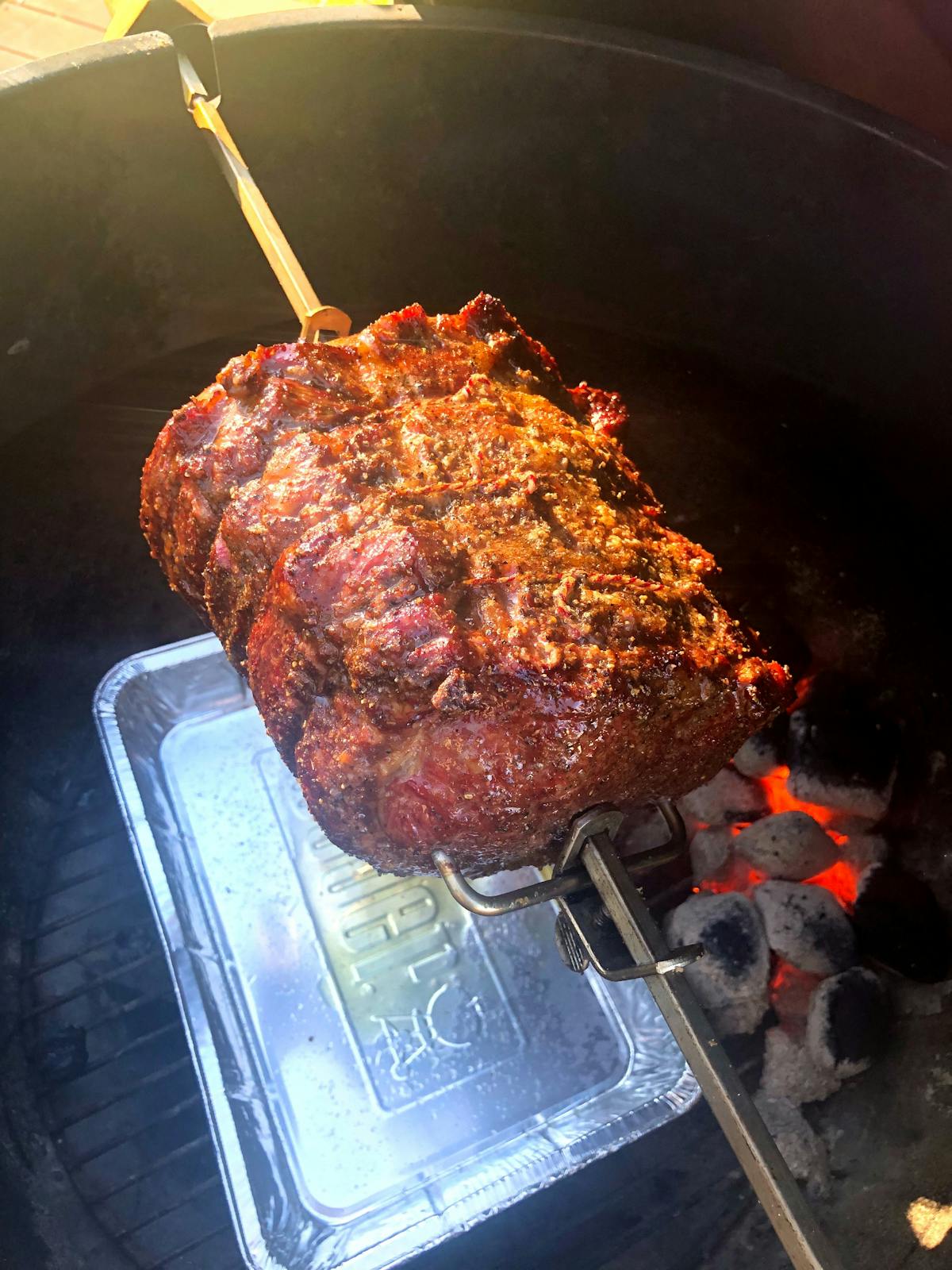 - 03 Center the roast on the rotisserie spit and secure it with the spit forks. Make sure the roast is centered before tightening the forks completely. Place the spit into the motor and turn it on. Place a disposable foil pan under the roast on the cooking grates to collect the drippings. Grill the roast over indirect low heat, with the lid closed, until an instant-read thermometer inserted into the center of the meat, not touching the metal spit, registers 51º to 54ºC for medium rare, 1½ to 1¾ hours.
