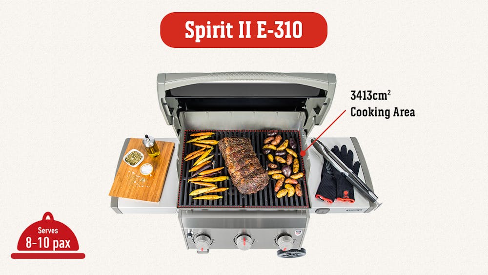 The Spirit II E-210 and E-310 can cook for up to 8 and 10 people respectively in a single batch, while the compact Q1200 gas grill caters to a smaller group of 6 maximum.