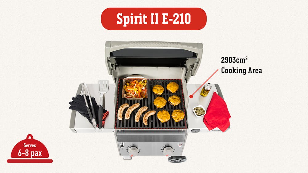 The new Spirit II E-310 gas grill has 3413cm2 of cooking area that lets you feed up to 10 people. Grill a whole chicken, a couple of steaks, half a dozen kebabs and a vegetable basket — all at the same time? Easy. If storage space is an issue and you need a slightly more compact grill, the two-burner Spirit II E-210 is able to fit on a balcony and still feed up to 8 friends with a generous 2903cm2 cooking surface.