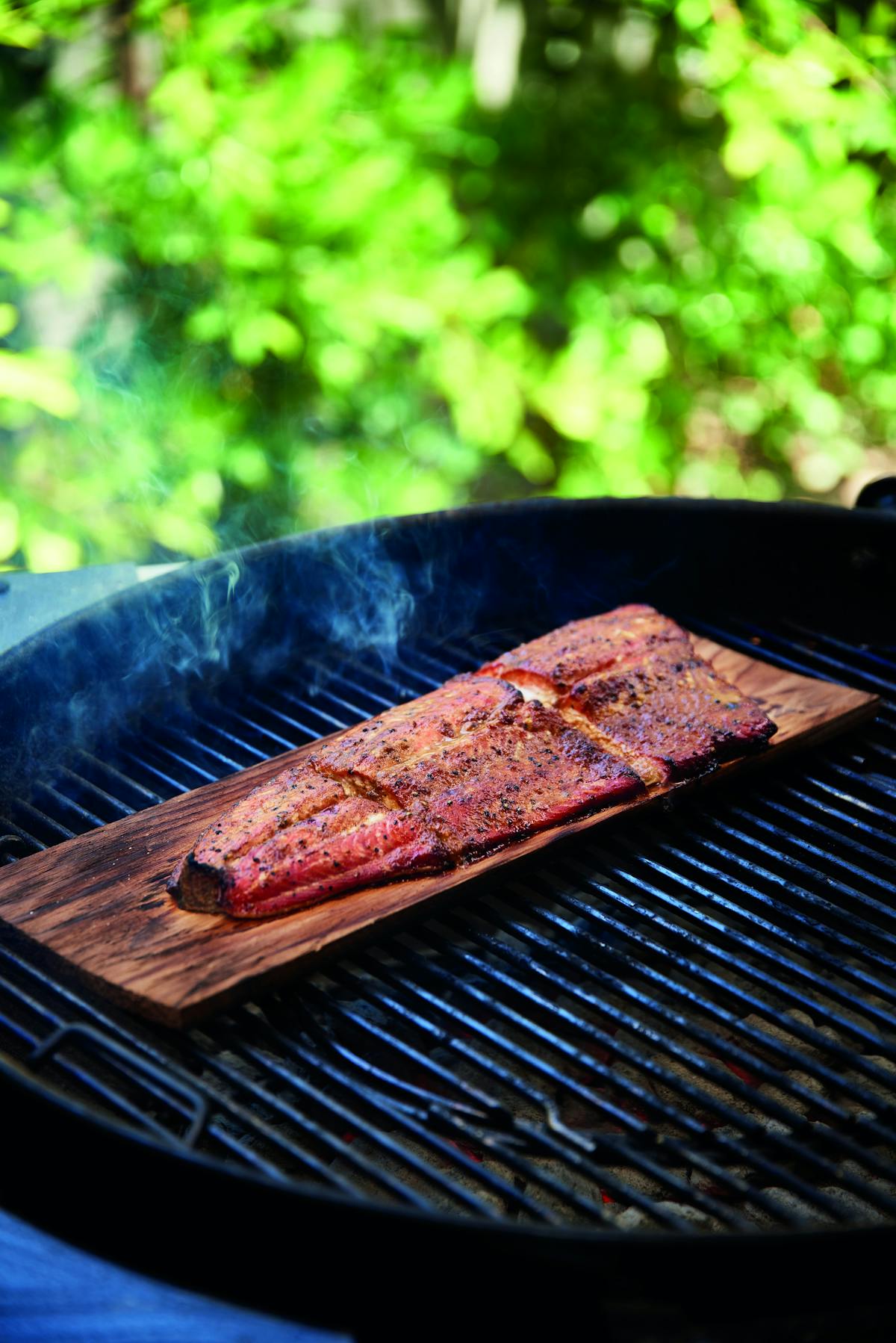 A classic and also a fan favorite from Weber's Greatest Hits. "The smoldering wood fills the inside of the grill with aromatic smoke, flavoring the fish as it gently cooks, and the dark, tangy glaze of mustard-spiked hoisin sauce adds a perfect layer of complex flavors." - Chef and Author Jamie Purviance