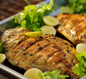 When it comes to choosing a protein to better your diet, fish always comes out on top as they have less saturated fat than meat. While most people think of salmon, there’s plenty of good catches that are just as good—and a little easier to get in this region. Pomfrets, for example, which we use in our Whole Grilled Masala Fish, are great on the grill and great for your health. They provide you with calcium, vitamins, iodine (important for your thyroid gland) and are also good for your eyesight.