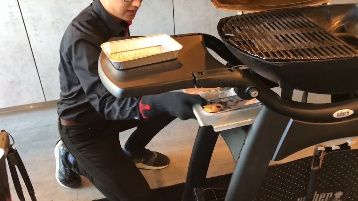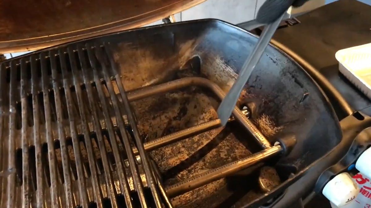 焼き網を外したら、スクレーパーでグリル内のごみを、下部のごみ受けまで落としてやって下さい。