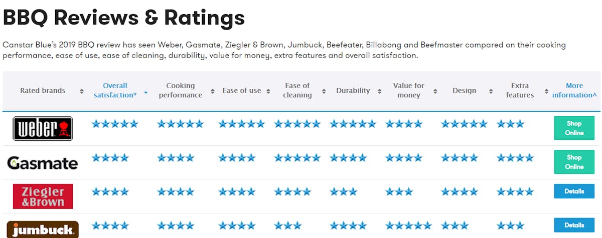Canstar Blueの2019 BBQレビューでは、調理性能、使いやすさ、掃除のしやすさ、耐久性、コストパフォーマンス、追加機能、全体的な満足度が比較されます。