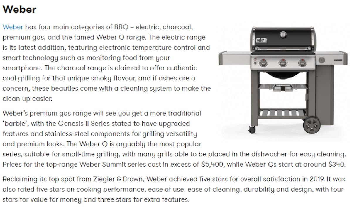 記事には”ウェーバーは今年の評価を独占し、総合的な顧客満足度、調理性能、使いやすさ、掃除のしやすさ、耐久性、デザインで5つ星を獲得”とあります。ぶっちぎりの独り勝ちですね。