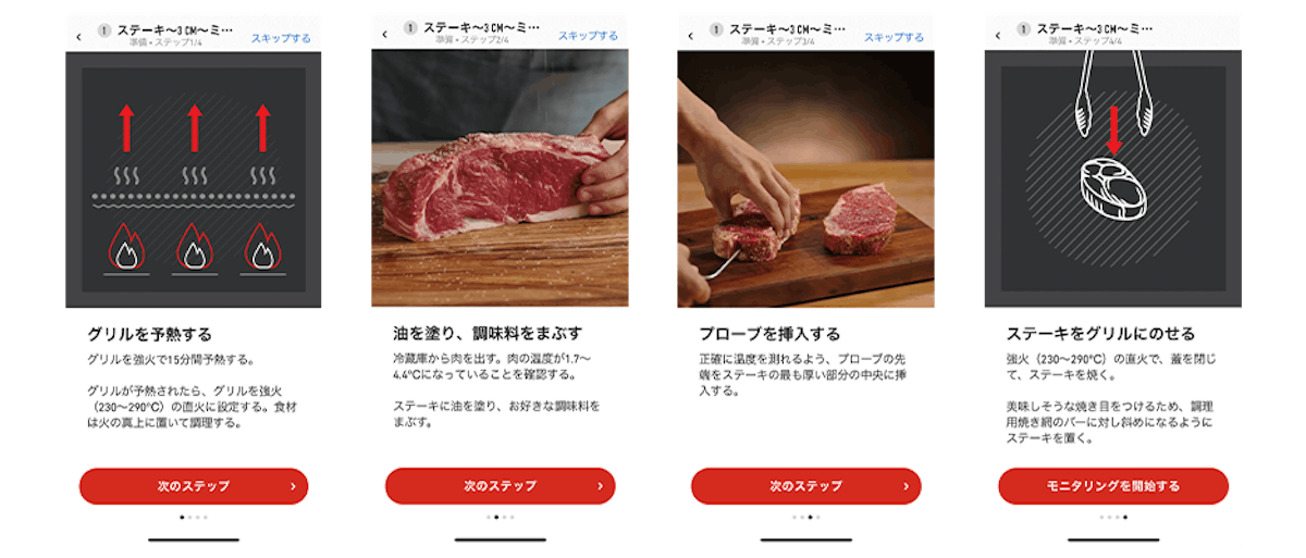 このスマートグリルハブはWeber Connectアプリと連携して温度を確認できるほか、焼き上がりまでの手順をステップバイステップで案内してくれます!手順を案内してくれるので、焼く前の食材をどう扱うのか分からない方も安心。スマートアシスタント機能で調理を完全にサポートしてくれます。また、食材を選択する以外にレシピもあるので、味付けに迷うこともなく様々な食材をアプリに任せて焼くことができます。