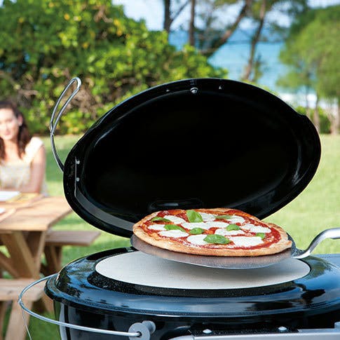 Deze pizzasteen is geschikt voor houtskool- en gasbarbecues. Hij is beschikbaar in twee verschillende formaten: klein met en diameter van 26 cm en een dikte van 12 mm en een grotere versie van 36,5 cm met een dikte van 12 mm. De kleine pizzasteen kunt u al gebruiken op houtskoolbarbecues met een diameter van 47 cm of gasbarbecues vanaf de Q1000.