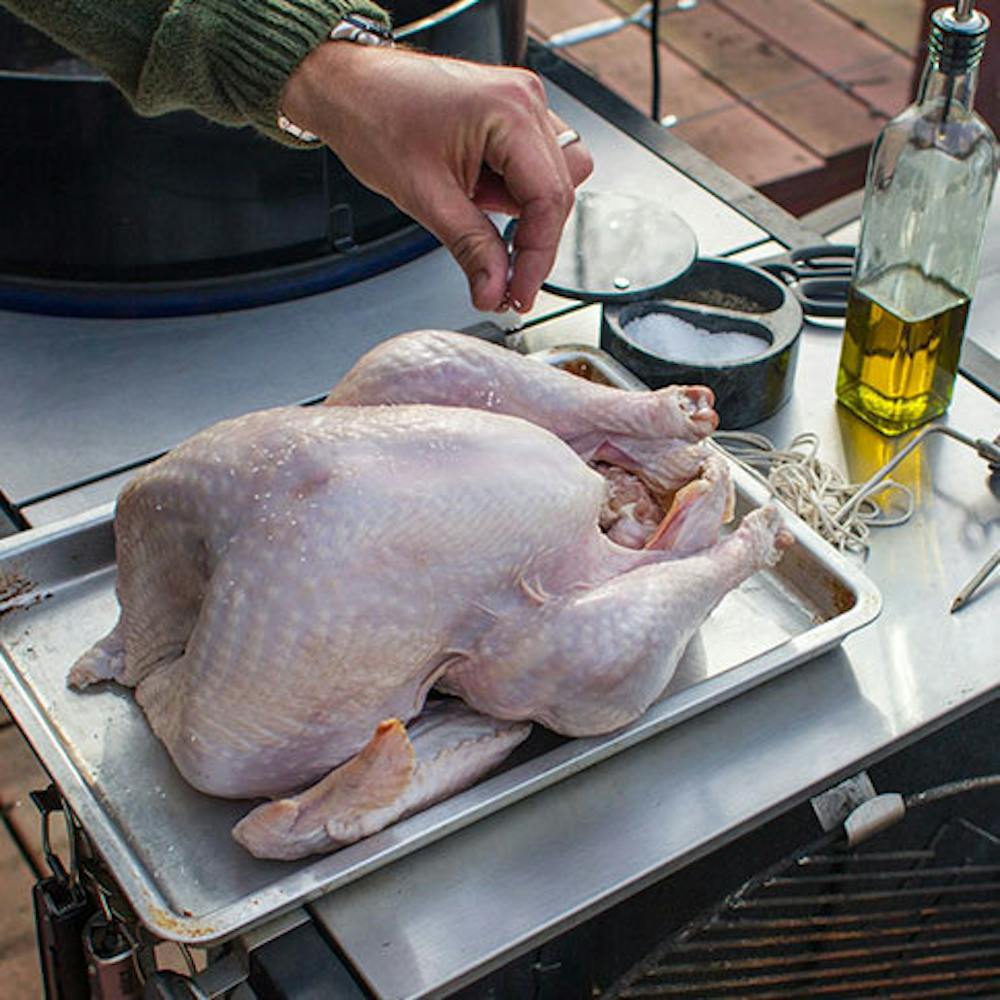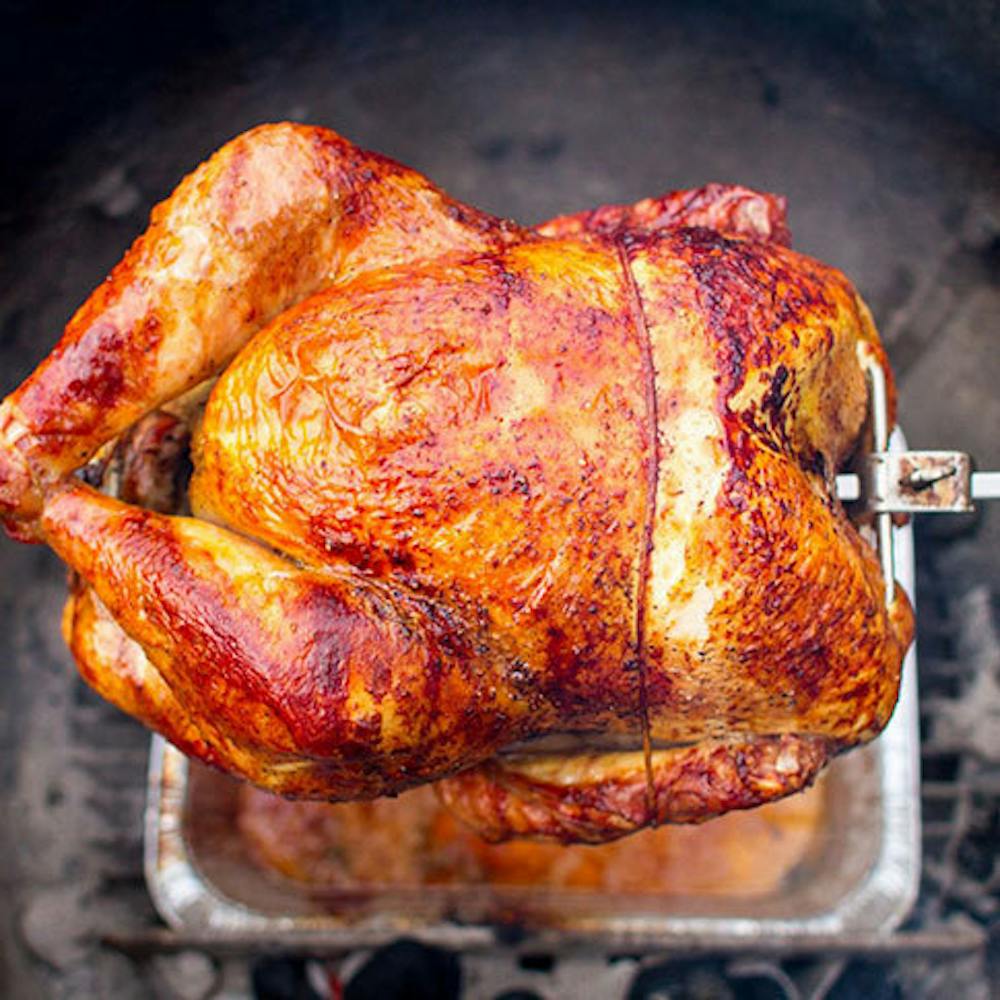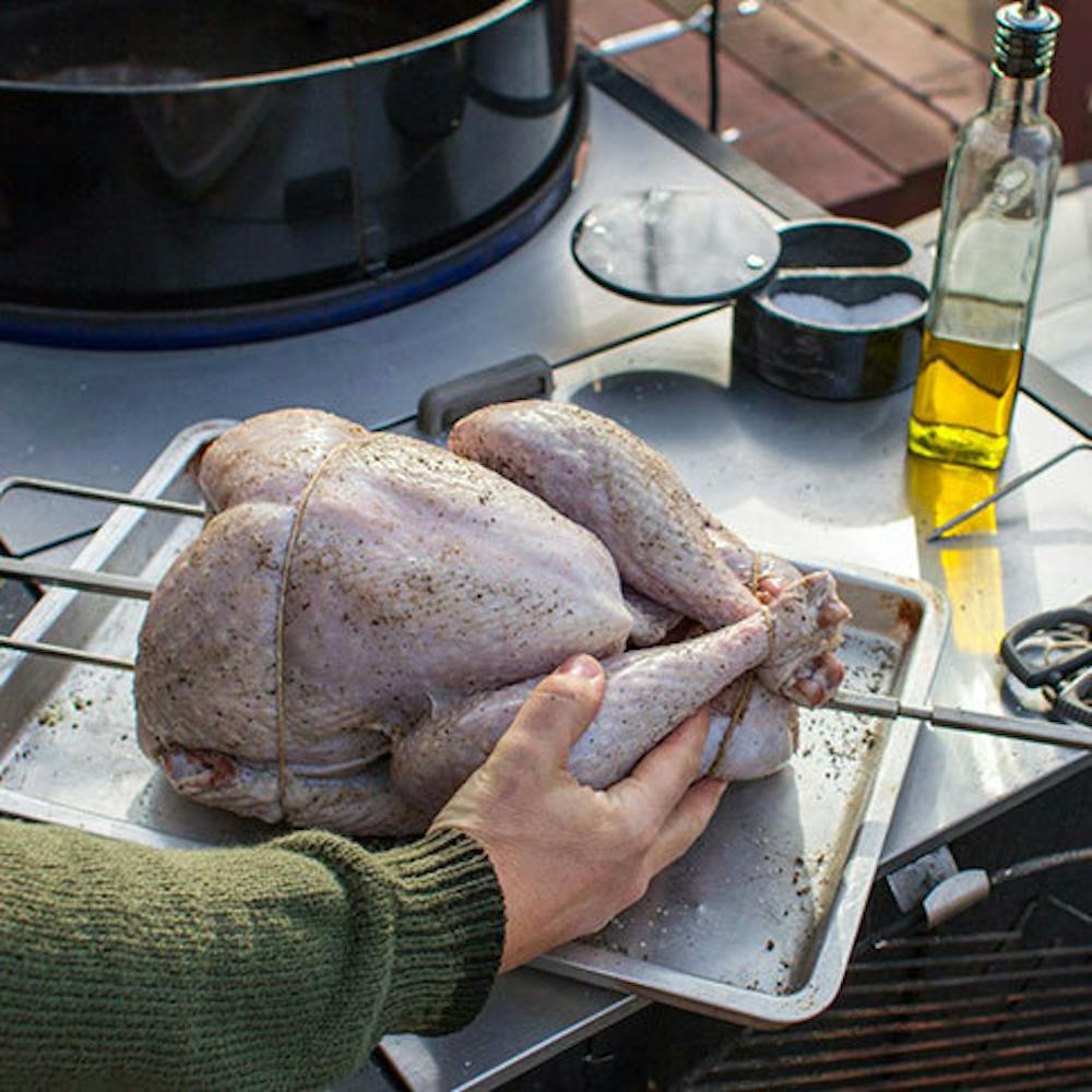 Zet het spit op de barbecue (in de ring). Een kalkoen van 7 kilo heeft ongeveer 2 tot 2,5 uur nodig om te garen. De kerntemperatuur dient dan 77°C te zijn.
