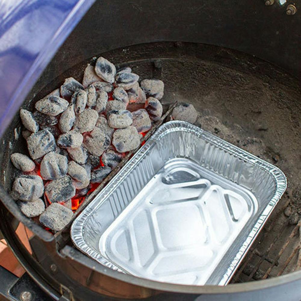 U kunt bijvoorbeeld Weber Char-Basket houtskoolhouders gebruiken om de briketten op hun plaats te houden en een aluminium lekbakje om sappen op te vangen.