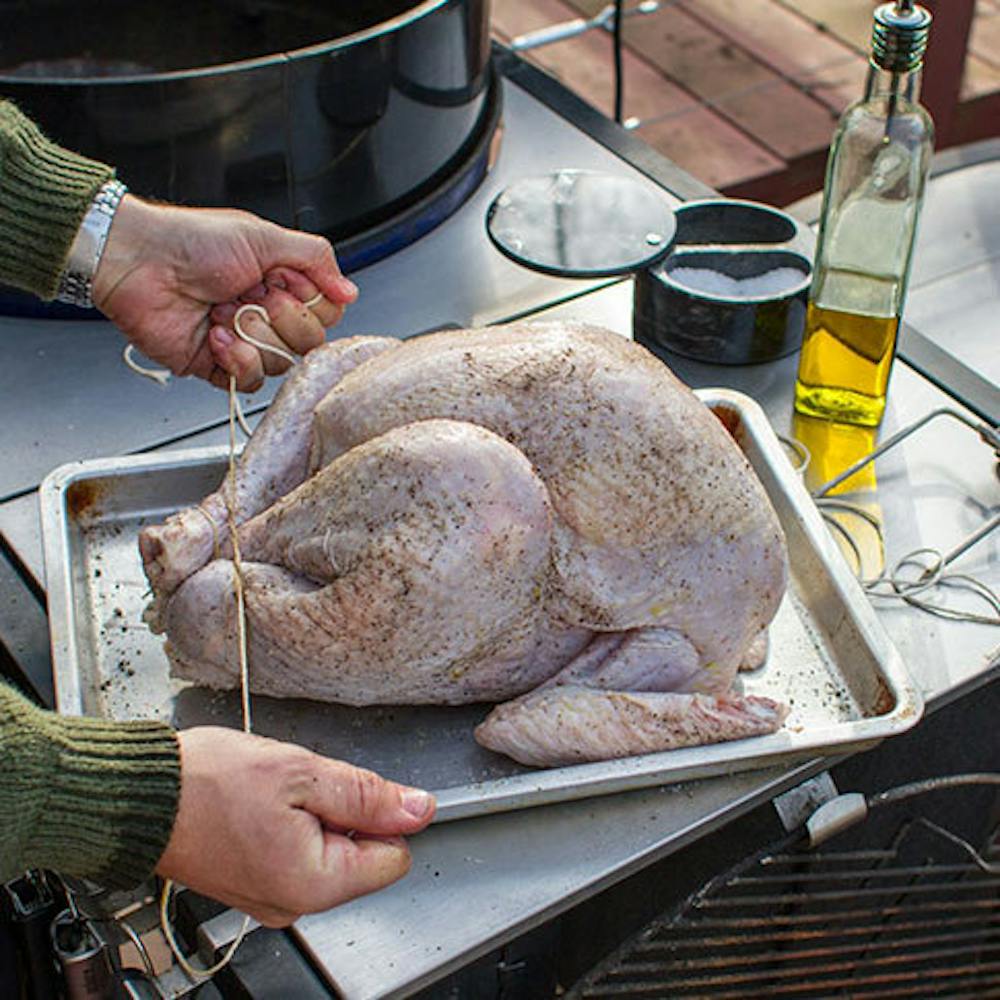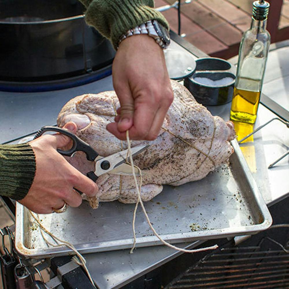 Bind de kalkoen stevig bij elkaar met slagerstouw. Vergeet de poten en vleugels niet!
