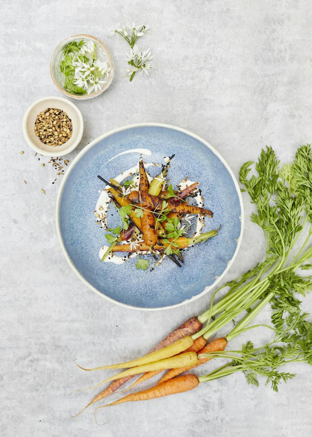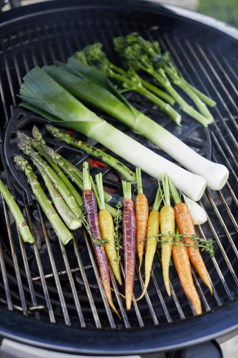 å bruke Weber-griller. «Den høye, tørre varmen på grillen gjør også at du generelt sett kan steke grønnsakene mye raskere, noe som vil bidra til å bevare smakene.» Gulrøtter har sin topp om sommeren og høsten, de er gode energigivere og man antar at antioksidantene hjelper våre kognitive evner. Bland gulrøttene i en dressing av olivenolje, spisskummen, paprika og salt før du legger dem på grillen eller i en Weber-grillkurv. Når de er ferdigstekte, klemmer du noen dråper lime over dem og legger på en klatt med rømme: litt aroma og svalhet som en kontrast til grønnsakenes naturlige sødme.
