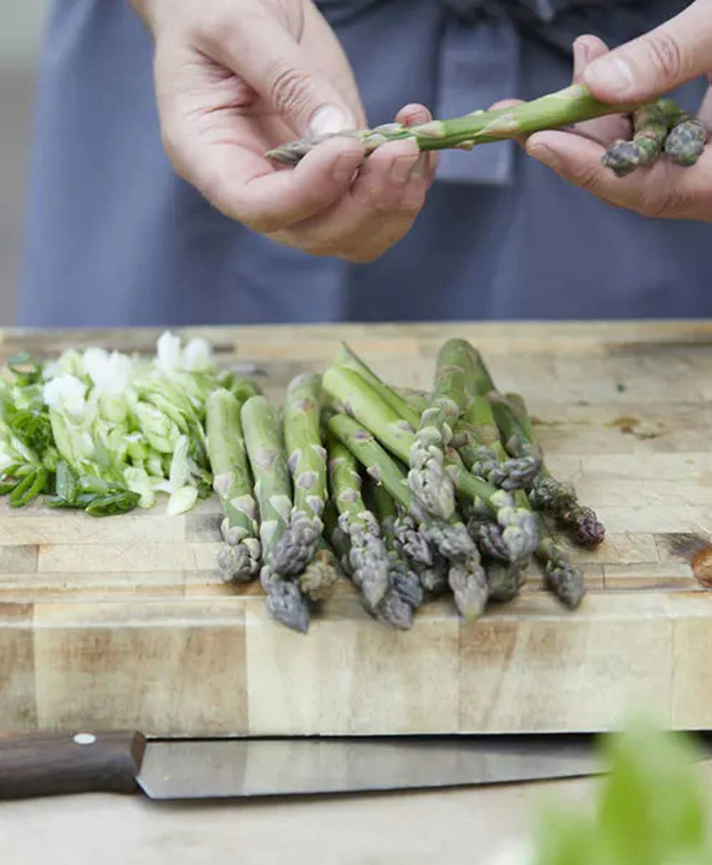 ... aspargesskudd, grønne og hvite stablet i rader i grønnsaksbodene bærer bud om at sommeren er her. Med riktig tilberedning blir disse kompakte, fiberrike grønnsakene knasende sprø, glatte og fulle av sin egen berusende smak. Krydres de lett med bare litt olivenolje og et stenk med salt, er asparges en flott siderett sammen med grillet laks eller urtekrydret kylling. Som Johnson sier: «Det er de subtile krydderne i balanse med hverandre som kan løfte en rett fra vanlige grillede grønnsaker til noe lekkert og fantastisk.»