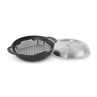 Bruk woken til å lage de beste "gryterettene", som skal stå og kose seg lenge under grillens lokk. Gi middagen en sunn twist og damp fisken og grønnsakene, eller hurtigstek woken for å gi den et hint av Asia. Wok-settet leveres med en rist med lokk til damping og en kraftig wok-panne, så her er mulighetene mange! Wok-pannen er av porselensemaljert støpejern, så du slipper å være bekymret over at maten skal brenne seg fast.