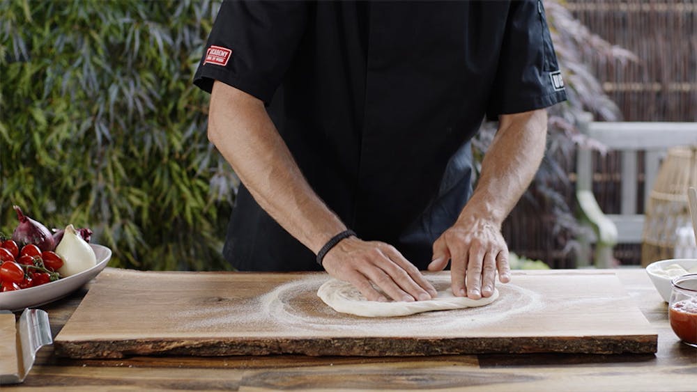 Pizzasteinen er, som du sikkert har forstått nå, en nøkkelbrikke når det kommer til å gi deigen en sprø karakter. Weber tilbyr pizzasteiner som er laget i både glasert cordieritt og steintøy, som er materialer som gir god varmebevaring og varmeledningsevne. Her bruker vi Weber Premium Pizzastein, som passer til de fleste gass- og brikettgriller. Ved å legge pizzadeigen direkte på steinen kommer den i kontakt med den høye varmen, uten fare for å bli brent av de åpne flammene. Om du i tillegg legger durumhvete på steinen, blir pizzaen veldig enkel å ta ut når den er klar.