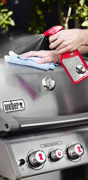 Til rengjøring og vedlikehold av gassgrill med yttersider av rustfritt stål anbefales bruk av Weber Grillrens – Stainless Steel som sprayes på overflatene og som gjør det enklere å holde de rustfrie stålflatene rene – samtidig som den beskytter overflatene mot overflaterust.