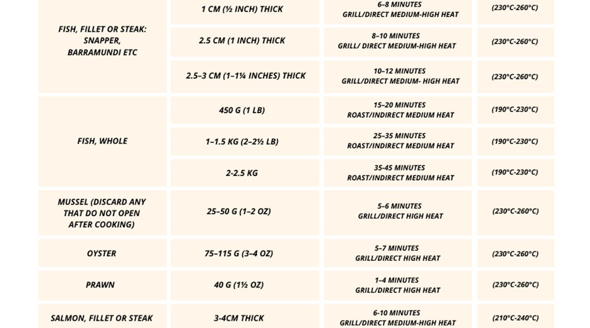 Cooking times are affected by such factors as altitude, wind, outside temperature, and how ‘well done’ you like your seafood. So, the following cuts, thicknesses, weights, and barbecuing times in the table below should be viewed as guidelines rather than hard-and-fast rules.
