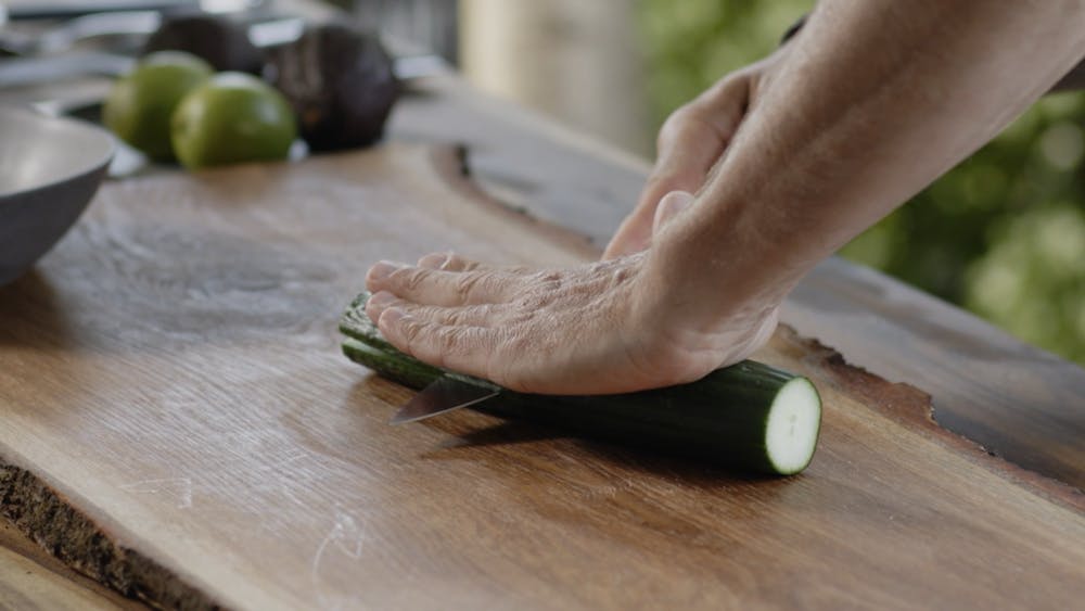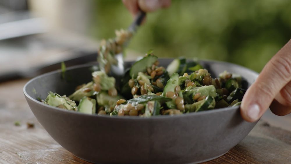 Till det här grillade ankbröstet ska du inte bjuda på en apelsinsås utan på en sallad med gröna linser. Gröna linser är mättande och rika på protein. Dessutom är de riktigt goda! Blötlägg gärna linserna innan du kokar dem. Då blir du av med lektinerna som kan orsaka magsmärtor. När de gröna linserna kokat klart låter du dem svalna. Under tiden grillar du gurkan. Det kanske kan låta lite konstigt att grilla gurka, men det ger gurkan en helt ny smakdimension – det är mycket godare än du kan tro. Dela gurkan först på längden och gröp ur gurkans innandöme med hjälp av en sked. Gurkan ska grillas med den skurna sidan mot gallret i några minuter.