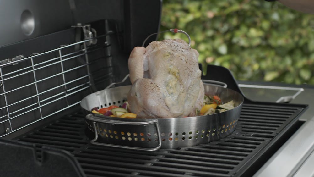 Med rätt grill och tillbehör på plats kommer du att bli överraskad av hur enkelt det faktiskt är att grilla en hel kyckling. Det kan verka lite krångligt, och kanske till och med skrämmande, till en början, men faktum är att grillen sköter den största delen av jobbet. Det enda du behöver göra är att förbereda kycklingen och tillbehören, förvärma grillen till 200 grader och sedan stänga av brännaren för att få indirekt värme. Anslut temperaturgivaren till WEBER CONNECT, stäng locket och lämna resten av tillagningen åt grillen. När telefonen säger 73 grader och kycklingen har fått vila utanför grillen i 15 minuter är det dags att ropa alla gäster till bords!