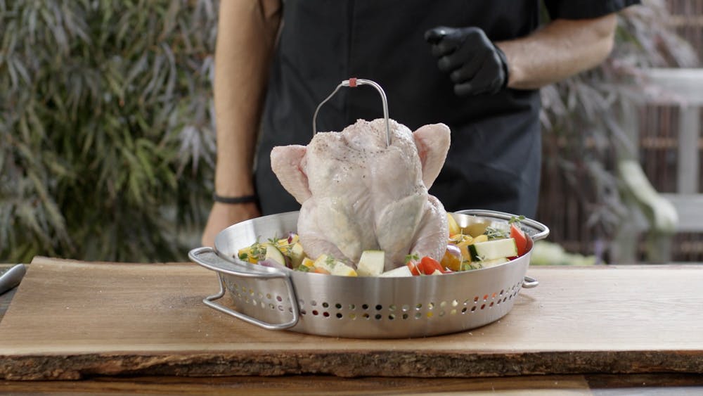En av de stora fördelarna med att tillaga en hel kyckling i en kycklinghållare på grillen är att den har plats även för tillbehören. Placera ut dem runt om bägaren i mitten och låt hela middagen tillagas på en och samma enhet. Det gör att du slipper springa in och ut mellan kök och grill, och istället kan luta dig tillbaka och låta grillen göra jobbet. De små hålen i kycklinghållaren ser till att värmen kan flöda igenom samt att både kyckling och tillbehör tillagas på ett kontrollerat sätt.
