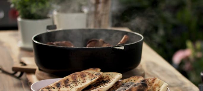 Festmåltid med en touch av det marockanska köket - Bräserad lammlägg med naanbröd